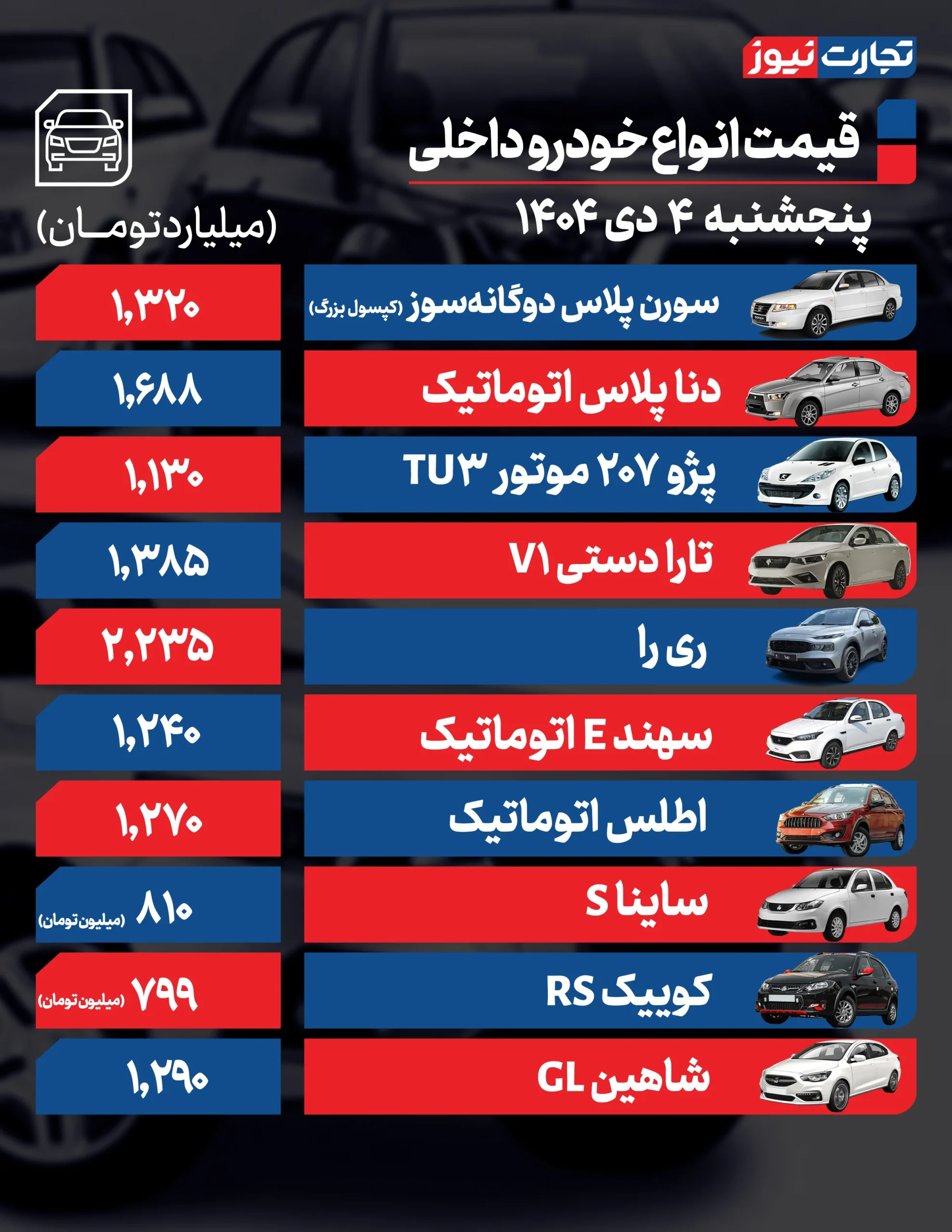 قیمت خودرو امروز 4 دی 1404 در شرایطی اعلام شد که که روند کلی بازار بار دیگر صعودی شد. به باور کارشناسان، وضعیت کنونی بازار خودرو حاصل همزمانی چند عامل اثرگذار است و نمیتوان آن را تنها به نوسانات کوتاهمدت نسبت داد.